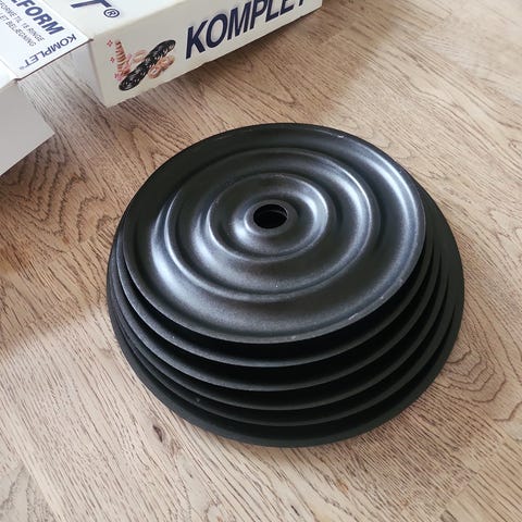 Kransekageforme til at lave nemme og fine kransekager med. Fremstår som nye.