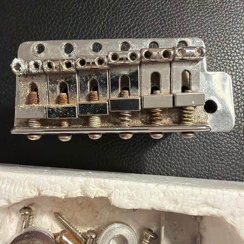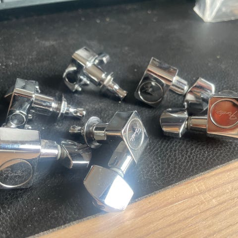 Fender guitarudstyr bestående af stemmeskruer og en mekanisk del med fjeder. Udstyret er lavet af metal og anvendes til justering og tuning af guitarstrenge.