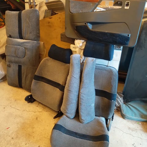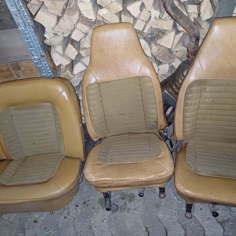 Tidlig mrk. 1 GL kabine til 5 dørs Ford Sierra. I Mocca brun (beige). Komplet inkl. båndmåtte, dørsider, konsoller og diverse beklædninger til Bagagerum. Inkl. bundmåtte til bagagerum også i Mocca