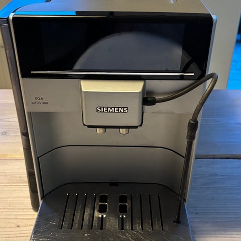 Siemens espressomaskine i sort farve. Maskinen har et kompakt design egnet til husholdningsbrug. Den er udstyret med en brugervenlig betjeningsflade og drypstop-funktion.