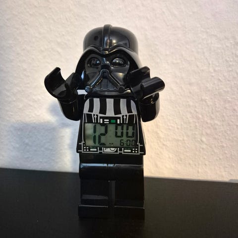 LEGO Star Wars Darth Vader vækkeur med digitalt display. Uret er formet som en Darth Vader-figur fra Star Wars-temaet og har funktioner til at indstille tid og alarm.