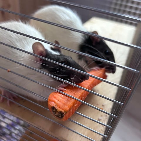 To mega søde tamme hunrotter, nysgerrige, sociale, kommer når man kalder. Vandt til børn. Rottebur og udstyr medfølger. De er 1,5 år gamle. Vi har desværre ikke tid til at tage os af dem på den måde de fortjener. Vi søger derfor et nyt kærligt hjem til dem.