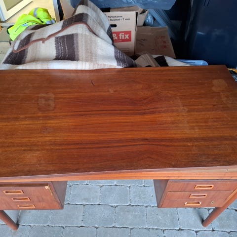 Skrivebord i teaktræ med flere skuffer til opbevaring. Bordet har et klassisk design og er velegnet til kontor eller hjemmekontor. Materialet er teaktræ, som giver en varm og naturlig finish.