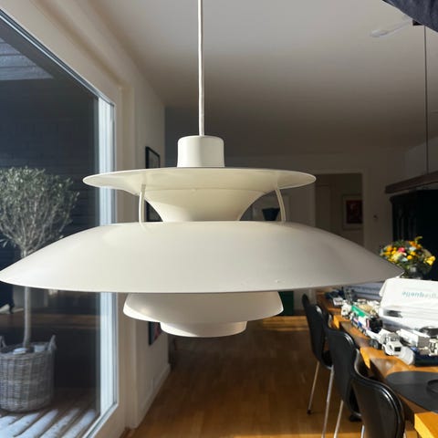 Louis Poulsen PH 5 pendellampe designet af Poul Henningsen. Lampen har en karakteristisk skærmopbygning med flere lag, der sikrer blændfri belysning. Fremstillet i metal med hvid finish. Velegnet til ophæng i stue, køkken eller spisestue.