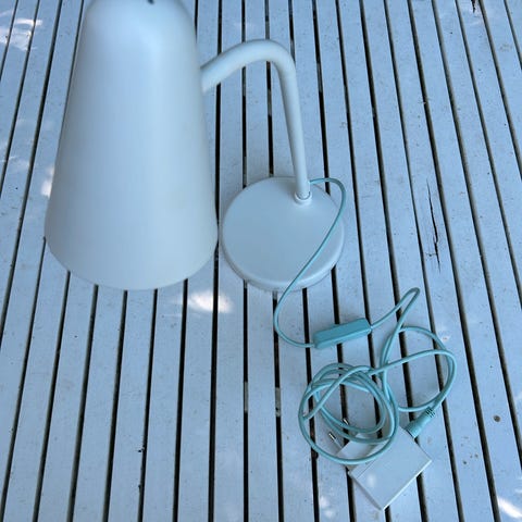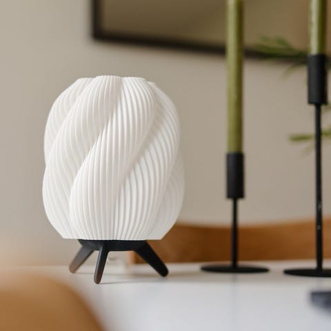 bordlampe med hvid skærm og base. Lampen har et plisseret design, der giver et dekorativt udseende. Velegnet til brug som bordlampe i forskellige rum.
