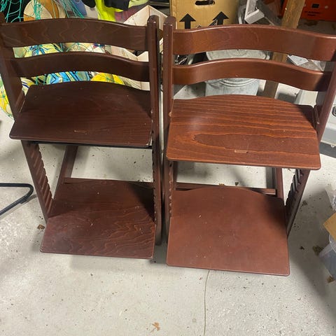 Stokke højstol i blå træ. Højstolen er designet til børn og kan justeres i sæde- og fodstøttehøjde for at tilpasse sig barnets vækst. Fremstillet i træmateriale med en robust og stabil konstruktion.