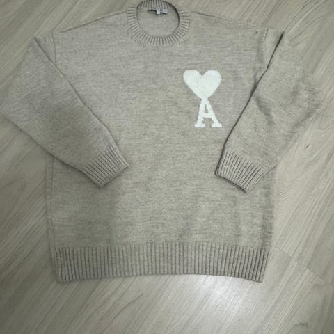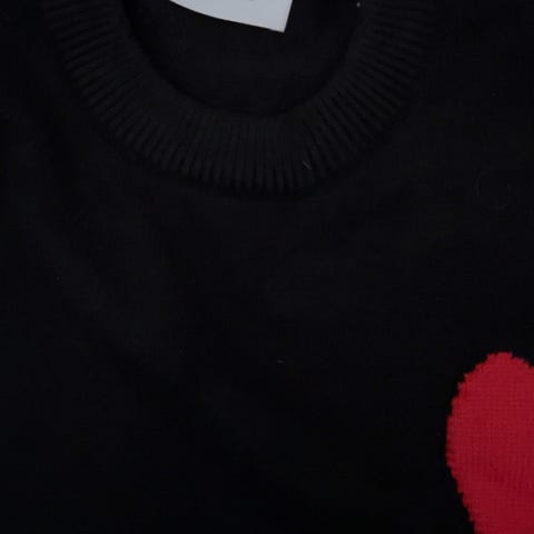 Ami Paris striktrøje i sort farve, fremstillet af uld. Modellen er designet til herre og har størrelse L. Trøjen har en rund halsudskæring og et rødt hjerte med bogstavet A som detalje på fronten.
