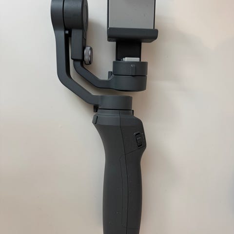DJI Osmo Mobile 2 er en gimbal designet til smartphones. Den har en grå farve og er udstyret med kontroller til optagelse og bevægelse. Gimbalen stabiliserer optagelser og forbedrer videokvaliteten ved håndholdt brug.