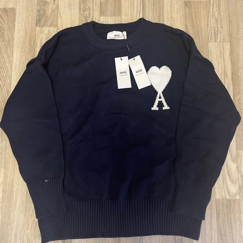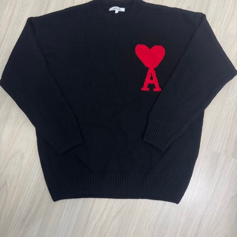 Ami Alexandre Mattiussi uldtrøje i størrelse L til mænd. Trøjen er beige og lavet af uldmateriale. Den har et hjerte med bogstavet A som motiv på forsiden.
