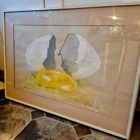 Abstrakt maleri med farverigt motiv i stort format. Maleriet indeholder nuancer af orange, rød, sort, blå og grøn. Velegnet til dekorativ brug i hjem eller kontor.