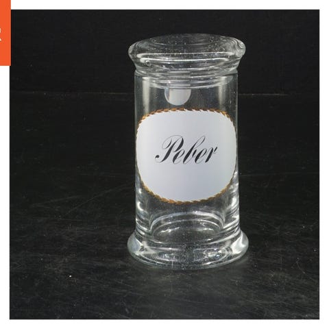Royal Copenhagen krydderiglas med korkpropper. Sættet består af fire hvide glas med tekst på, der angiver forskellige krydderier. Materialet er keramik med korkpropper til lukning.