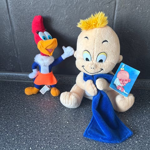 Woody Woodpecker bamse i blå, rød og hvid farve. Blødt materiale, egnet som legetøj eller samlerobjekt. Vintage Retro.
