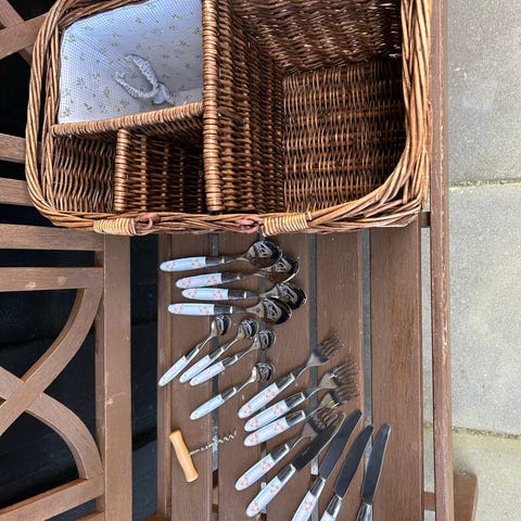 Picknick kurv, Bambus kurv med tilbehør. Blå hvid dug. se billederne.