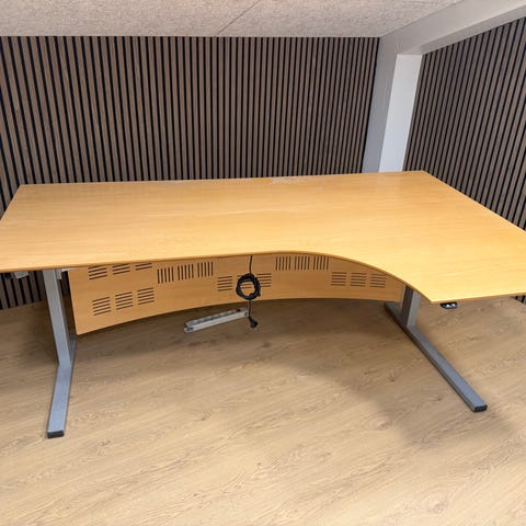 Linak skrivebord med bordplade i træ og sort metalstel. Bordet har en let buet form og to kabelgennemføringer. Egnet til brug som arbejdsbord eller kontorbord.