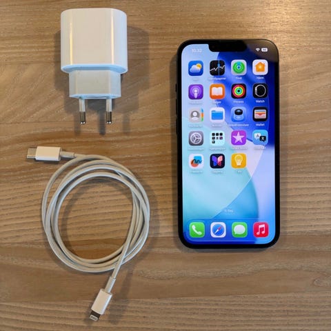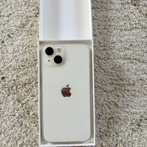 Apple iPhone 13 med 128 GB lagringskapacitet i hvid farve. Telefonen har et dobbeltkamera på bagsiden og en skærm med fladt design. Enheden har Lightning-port til opladning og dataoverførsel.