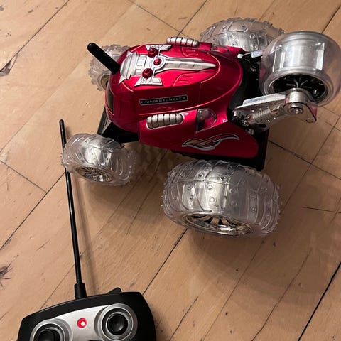 X-Drive fjernstyret bil i rød farve. Leveres med fjernbetjening med to styrepinde. Køretøjet har larvefødder til terrængående kørsel.