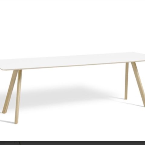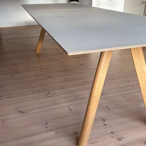 Super flot spisebord fra Hay. Hvid laminat bordplade og bordben i sæbebehandlet eg . Har en lille bitte skade på laminat bordpladen.