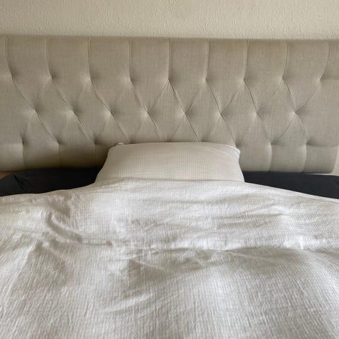 Det er lavet af to MDF-plader, fyldstof og yderst mørkt uldstof. Flotte detaljer med store knapper, som dog nemt kan fjernes, hvis man ikke bryder sig om det look. Uldstoffet i sig selv har kostet 1000 kr. Stoffet er helt intakt og uden pletter eller støv, så sengegærdet ser ud som, da det var nylavet.