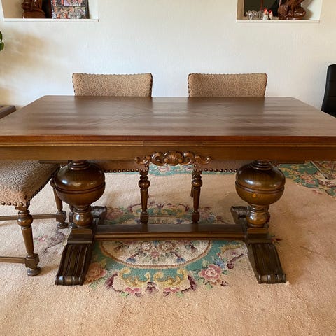 Træbord med tilhørende stole i træ. Bordet har en naturlig træfinish og stole med grønne polstrede sæder. Velegnet til spisestue.