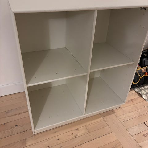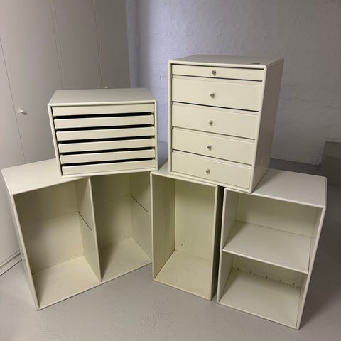 2 klassiske hvide Montana reoler sælges. Den ene reol har tre skuffer med et fint rødt knop-greb