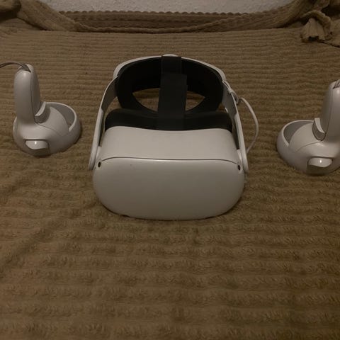Meta quest 2 som jeg har haft siden 2022 det er næsten ikke blevet brugt da loftet på mit værelse er for lavt og jeg slår mine hænder ind i loftet det forklarer også de små skræmmer på controllerene, det er også grunden til at jeg købte silicone covers.
