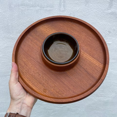 Bakke i teaktræ designet af Jens Harald Quistgaard. Stemplet i bunden “Dansk Designs Denmark IHQ”