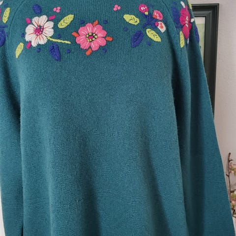 100% uld. Sødt broderi rundt omkring halsen.