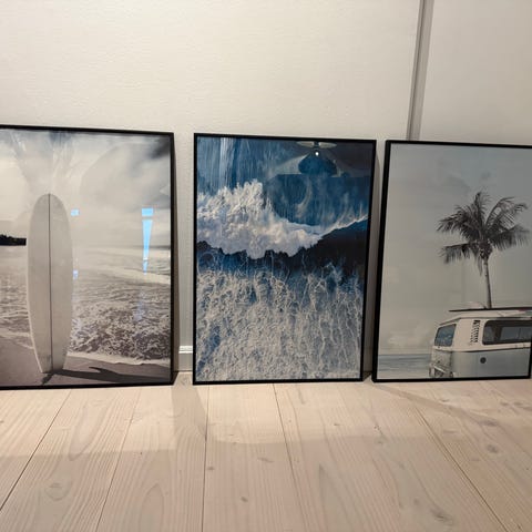 Tre tynde sorte rammer. To store på 53x78 cm og en mindre på 31,5 x 47 cm. De store er med plakater fra London Underground. Camden Lock by John Bellany og Simply Pubs and bars by Tube and Bus. Art of the Underground. Sælges samlet til i alt kun 100,- for alle tre. Sælges også enkeltvis til 55,- pr. stk. Kan også afhentes i Nørresundby eller måske leveres i det meste af Jylland. De er ikke som nye, men stadig i ok stand fra ikkerygerhjem uden husdyr. Rabat gives gerne ved køb af flere af mine annoncer