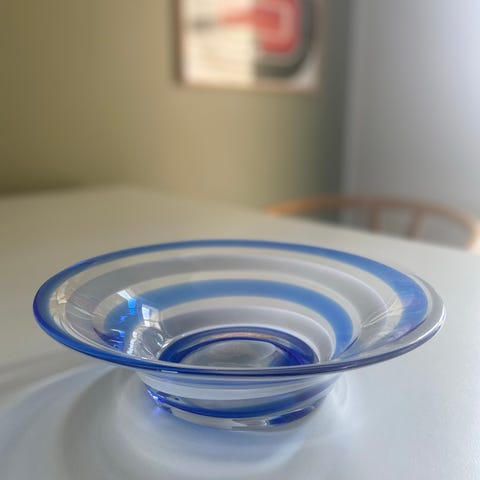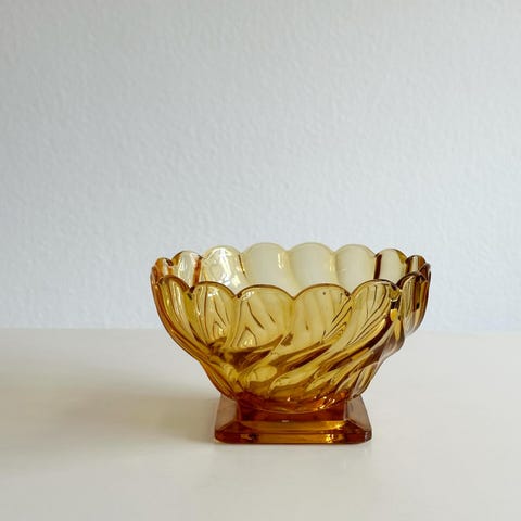 Glasskål med blomstermønster og hank af plast fra Walter glas Germany - 21cm lang, 14cm bred og 20 høj.