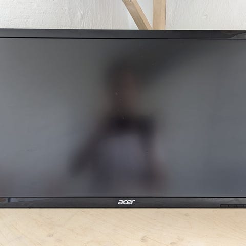 AOC 27" skærm med sort kabinet og HDMI-indgang. Der medfølger en justerbar skærmarm til montering. Der er en lille ubetydelig ridse i skærmen. God og billig ekstraskærm