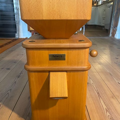 Jeg sælger min gode kornkværn fra Komo. Den kan både bruges som valse, kornkværn og som statist i din kommende film om det selvforsynende økologiske hjem, hvor børnenes skjorter er nystrøget og deres krøllede hår svajer let i brisen fra det åbne køkkenvindue, hvor din hjemmebagte skovbær-tærte køler af. NB: Pas på trolden ikke spiser den.