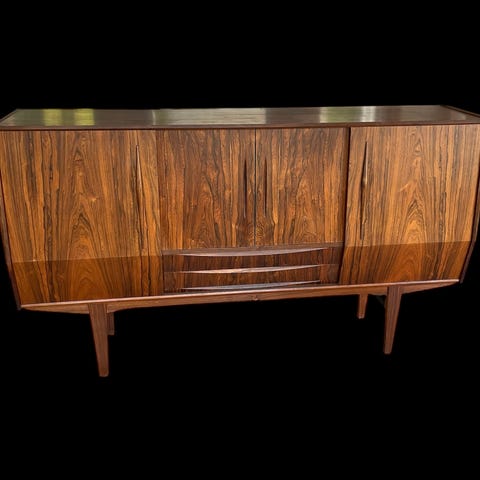 Smuk skænk i palisander med skråtstillede ben og skuffe øverst.