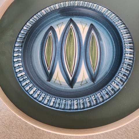 Knabstrup Fajance fad i turkis keramik med firkantet form og dekorativt mønster. Fadet har en ophængningsmekanisme på bagsiden, hvilket gør det velegnet til både servering og vægophæng.