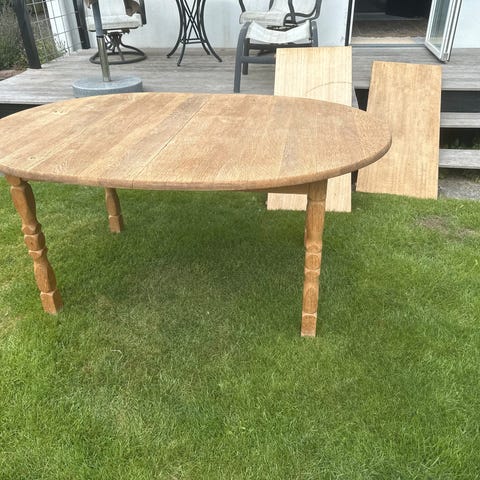 Ovalt spisebord i træ med mulighed for tillæg af 2 plader. En plade måler 42 cm.