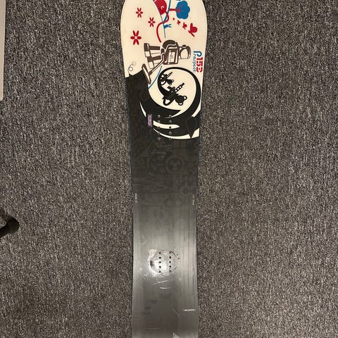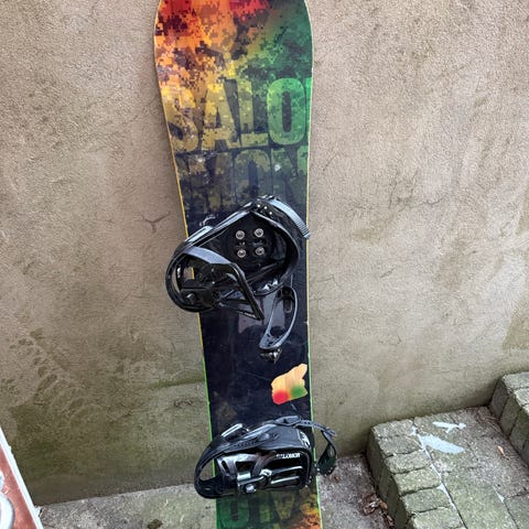 Salomon snowboard med bindinger, længde 155 cm. Snowboardet har en grafisk overflade med farver i sort, gul og lilla. Bindingerne er sorte og monteret på snowboardet. Velegnet til vintersport og snowboardingaktiviteter.
