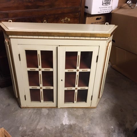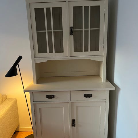 Hvidt vitrineskab i træ med to skuffer og to skabe. Skabet har glasruder i øverste skabsdøre, hvilket giver mulighed for visning af indhold. Velegnet til opbevaring i køkken, spisestue eller andre rum.