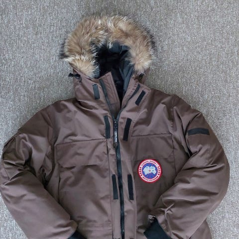 Canada Goose vinterjakke i størrelse L til mænd. Jakken er brun og lavet med dun som isoleringsmateriale, hvilket gør den velegnet til kolde vejrforhold.