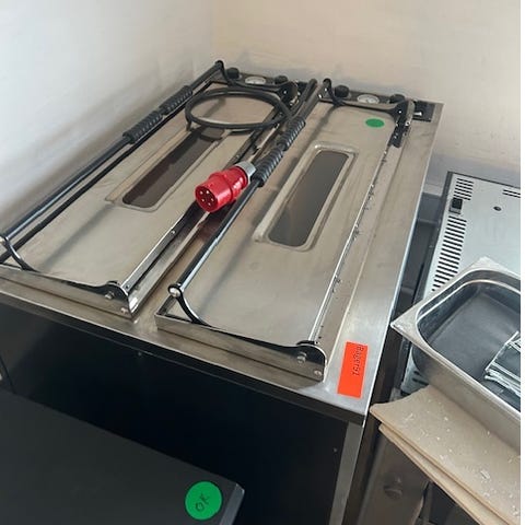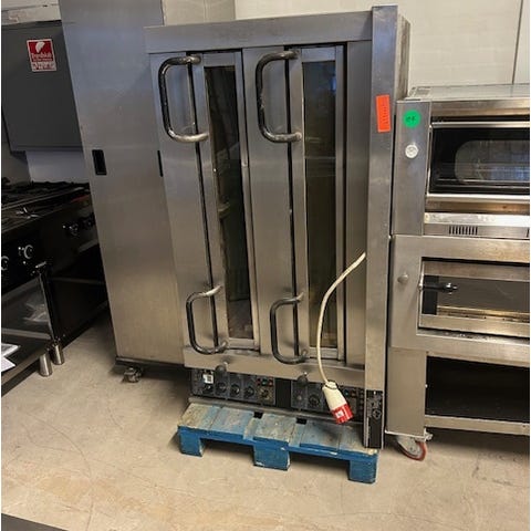 pizzaovn i rustfrit stål med to ovnkamre. Ovnen har håndtag til åbning af hvert kammer og kontrolpanel med knapper til indstilling. Velegnet til bagning af pizzaer og andre bagværk i professionelt køkkenmiljø. Afhentning selv