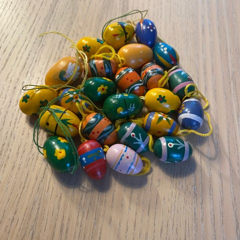 Store gamle træ-æg med kristne motiver. Højde på begge 10 cm, det brune med en lidt større dia.