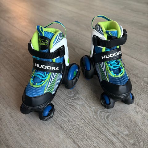 Hudora rulleskøjter til børn i størrelse 33. Skøjterne har justerbar størrelse og er designet til børns brug.