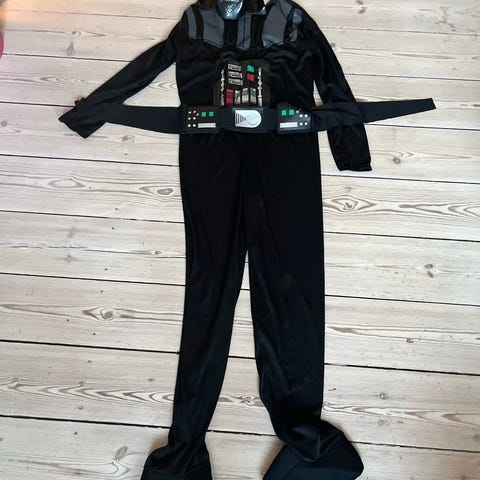 Darth Vader dragt til børn i størrelse 116. Dragten er sort og lavet af polyester materiale. Den er designet som en unisex dragt og inkluderer en maske som vist på billederne.