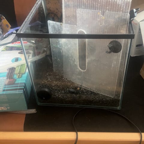 Glasakvarium med målene 36 cm i længden, 23 cm i bredden og 33 cm i højden. Akvariet er fremstillet i klart glas og har en kant med en mindre skade i hjørnet.