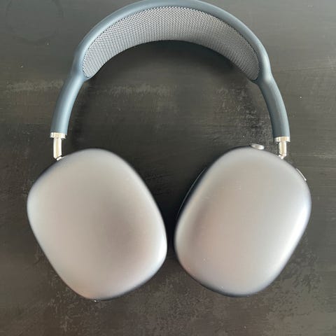 Apple AirPods Max hovedtelefoner i grå farve. Over-ear design med polstrede ørekopper og justerbar hovedbøjle. Leveres med et beskyttende etui. Til lightning kabel