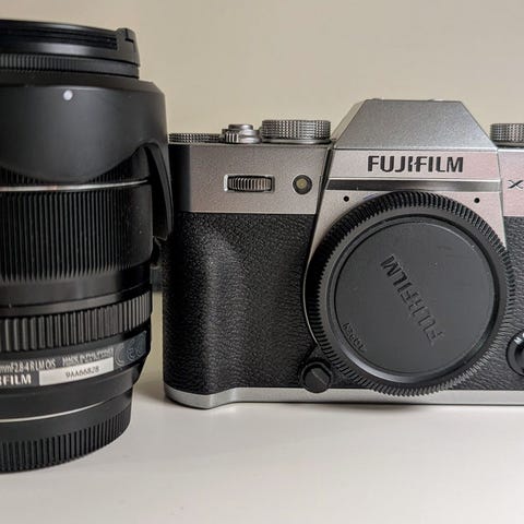 Fujifilm X-T3 spejlreflekskamera i sølv med tilhørende objektiv.