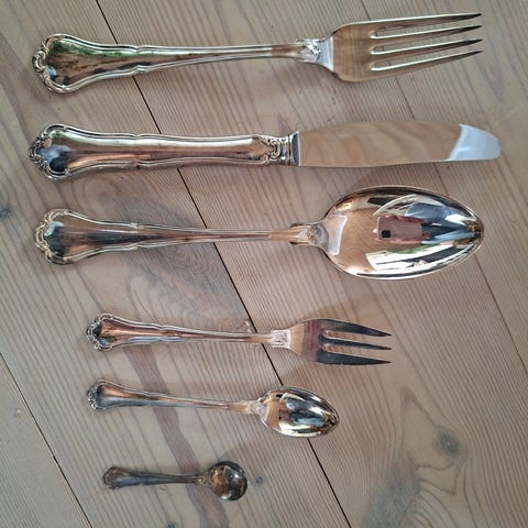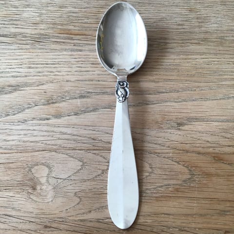 Annemarie Frigast middags/suppeske med detaljeret mønster på skaftet. Skeens materiale er pletsølv, og den har en blank finish. Velegnet til samling eller brug ved servering.