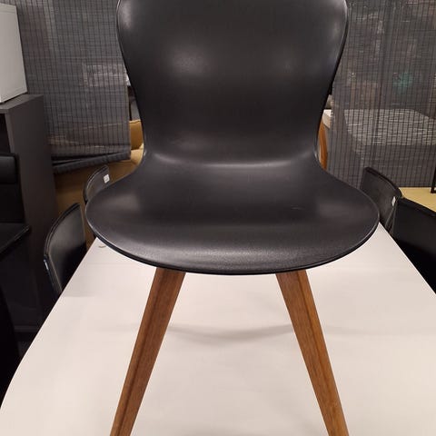 Stolen har en enkel, bølget form med en polstret overflade og sorte træben. Den er lavet af kunstlæder.