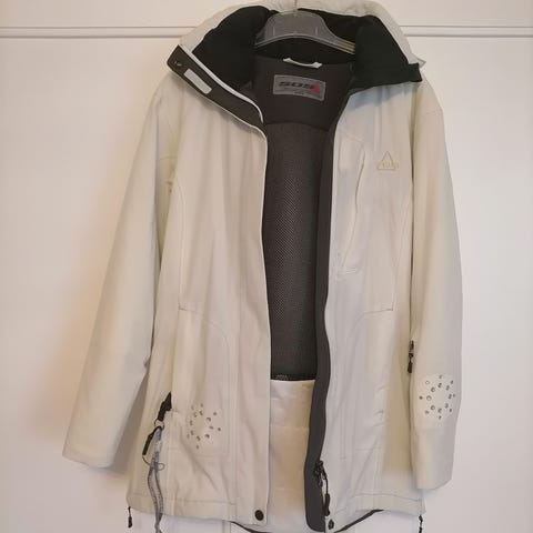 SOS skijakke str Small/36 i hvid med røde detaljer. Jakken er lavet af 100% polyester i yderskal og isolering, med for i 100% nylon. Designet til skiløb og udendørs aktiviteter.