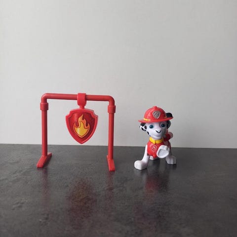Paw Patrol Marshall figur på snowboard i rød og gul farve. Figuren forestiller en dalmatiner med hjelm og rygudstyr, placeret på et snowboard. Figuren måler cirka 8 cm i højden.