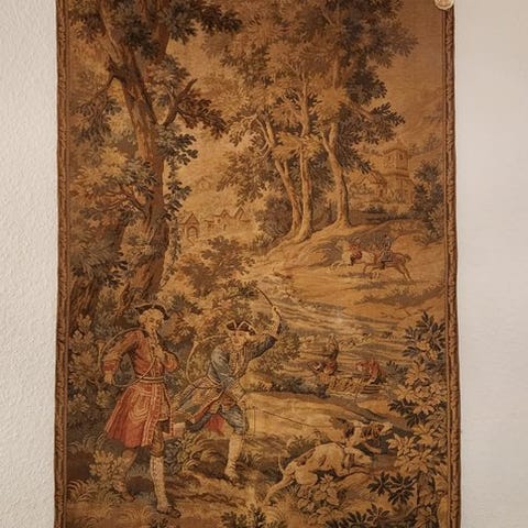 Bomuld- og rayonstapet i Rococo Aubusson-stilen, af en landlig romantisk scene med elegant klædte personer, 88 cm x 133 cm, dateret ca. 1950–1970, med integreret ophængssløjfe til vægmontering, fra Frankrig eller Belgien. Klik på den blå "gå til varen" knap, for at købe eller byde på denne vare. Den samlede pris vil blive vist inden du afgiver dit bud.