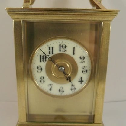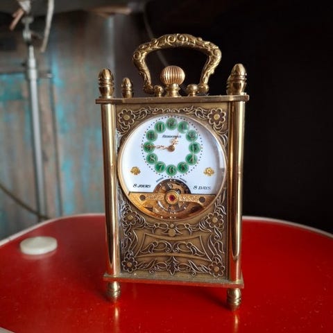 Matthew Norman rejsekøremaskine med mekanisk uretsværk og otdages gangreserve, i et belagt guld og glas hus fra Schweiz (1990–2000) med komplet kalender, månefaser og flerlags helkamps slag, i nærmest nyt og i funktion, med optrækningsnøgle, mål 140 × 95 × 85 mm, vægt 3 kg, leveres med en lycra-læderboks. Klik på den blå "gå til varen" knap, for at købe eller byde på denne vare. Den samlede pris vil blive vist inden du afgiver dit bud.
